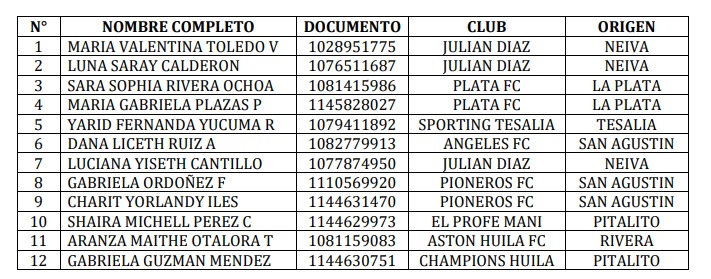 Mediante resolución la Liga de Fútbol del Huila dio a conocer la lista de seleccionadas para la selección sub - 13 de fútbol sala.