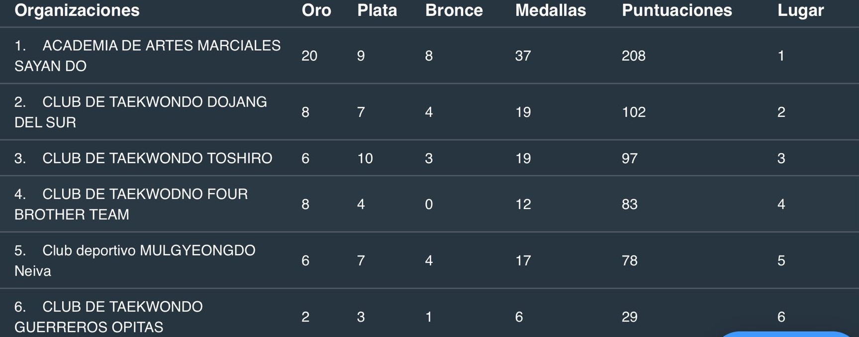 El evento dejó como gran ganador al club Sayan Do de Garzón con 208 puntos y 37 medallas (entre ellas 20 oros) mientras que en segundo lugar quedó el Club Dojang del sur de Pitalito, de Neiva el más destacado fue el Club Toshiro que quedó de tercero.