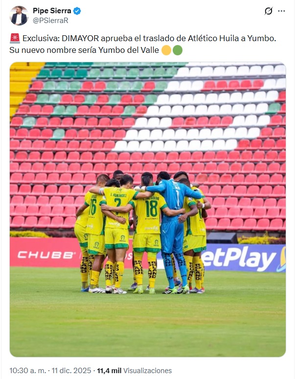 En el marco de la Asamblea Extraordinaria de la Dimayor se ha conocido de manera extraoficial la aprobación del traslado del elenco huilense al Valle del Cauca, concretamente a la localidad de Yumbo como se manifestó previamente; en cuanto al nombre, si bien se comentó que sería Yumbo del Valle, ahora se ha conocido que el club tomará el nombre de Independiente Yumbo desde febrero.