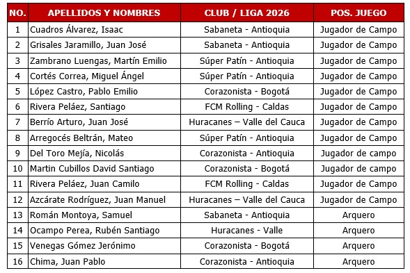 Para esta primera convocatoria, la Federación reunió a 16 jugadores provenientes de seis clubes de las ligas de Antioquia, Bogotá, Caldas y Valle del Cauca, quienes hacen parte del calendario competitivo de la temporada 2026.